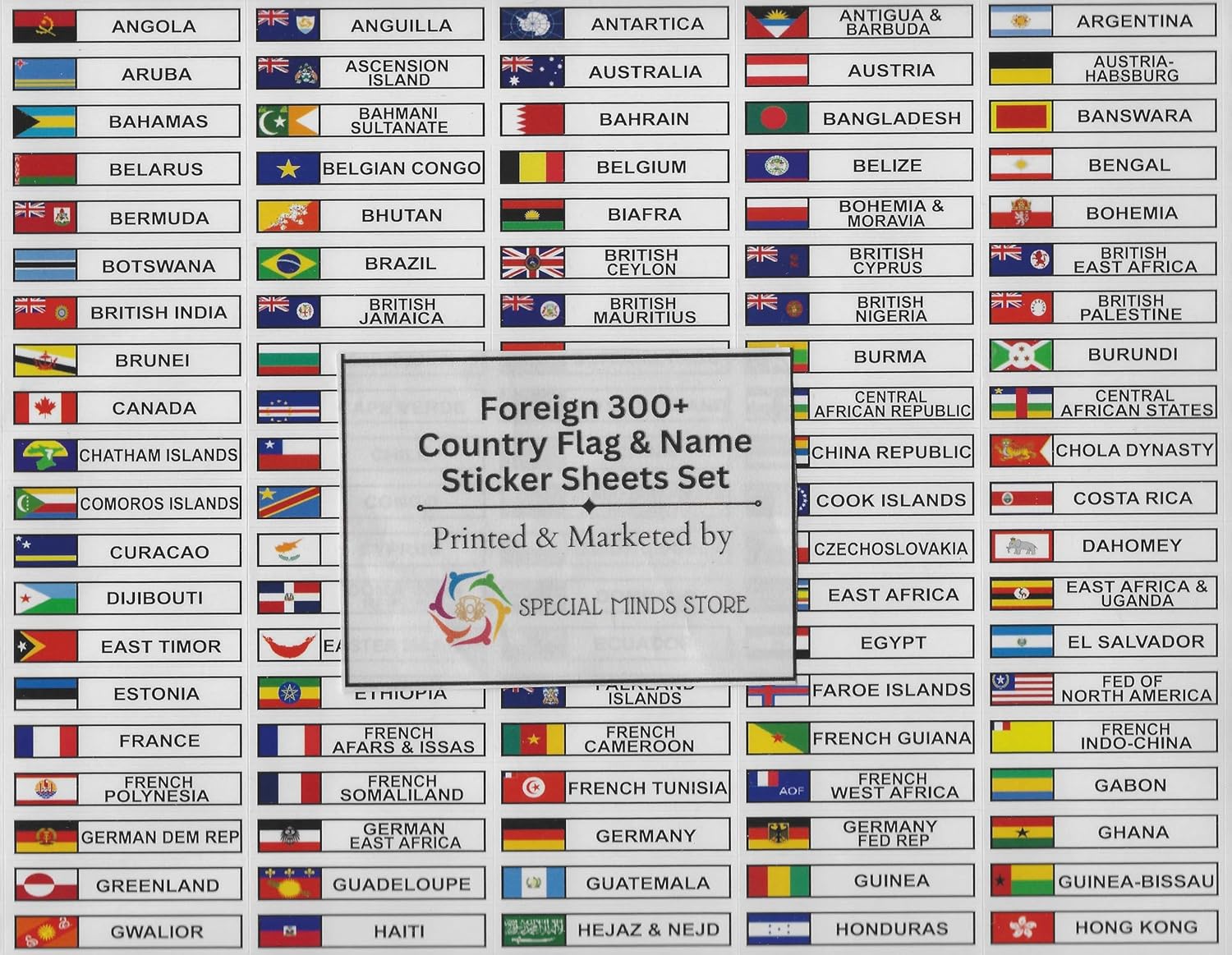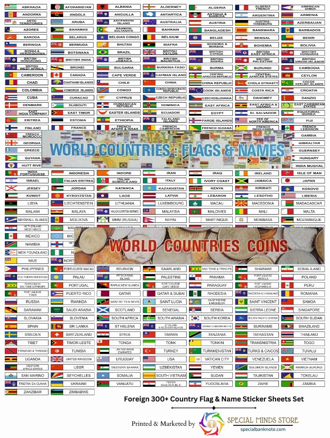 Special Minds Store® Foreign 300+ Country Flag & Name Sticker Sheets Set, Multicolor Sticker Sheets Set